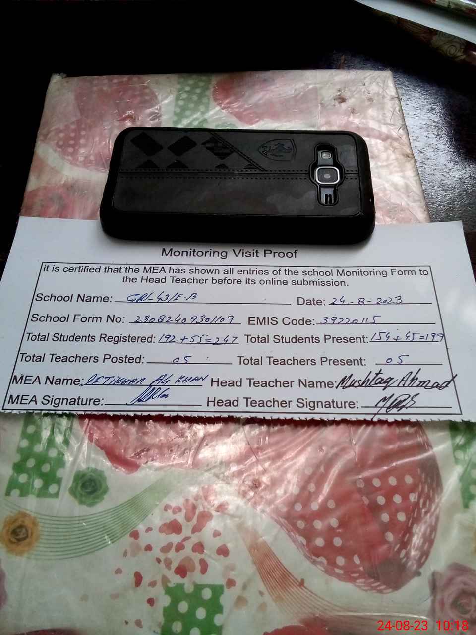 | Name: MAS**** AZ**** Designation: (School Headmaster's/Headmistress's) EST Phone/Cell Number: 03**** |