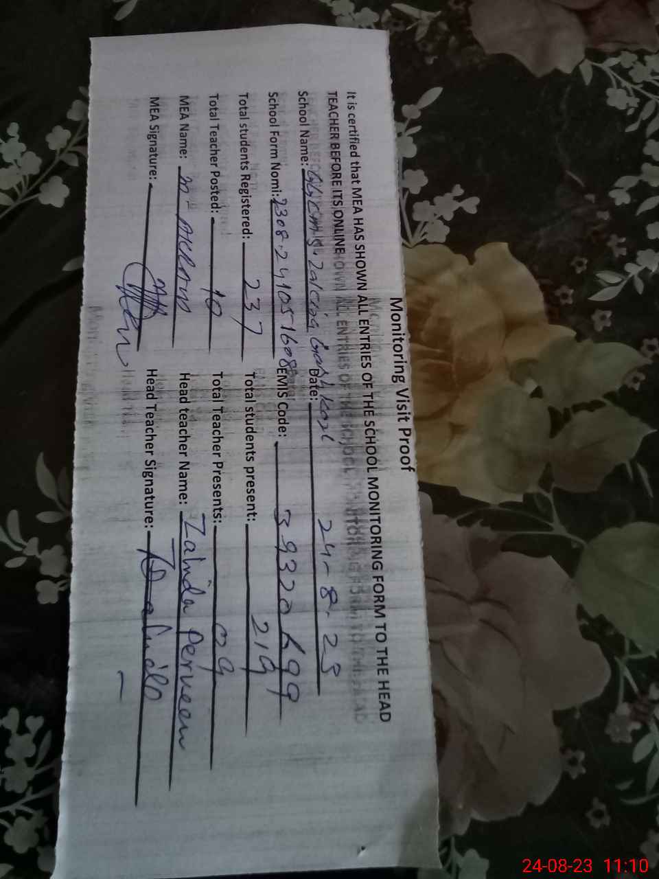 | Attendance Register | Head Teacher | MEA with School | Visit Proof |