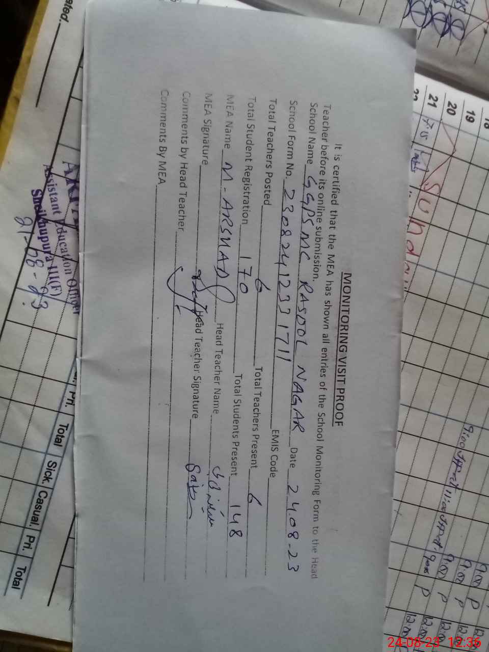 | Attendance Register | Head Teacher | MEA with School | Visit Proof |