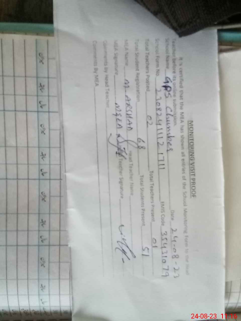 | Attendance Register | Head Teacher | MEA with School | Visit Proof |