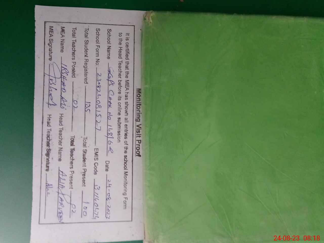 | Attendance Register | Head Teacher | MEA with School | Visit Proof |