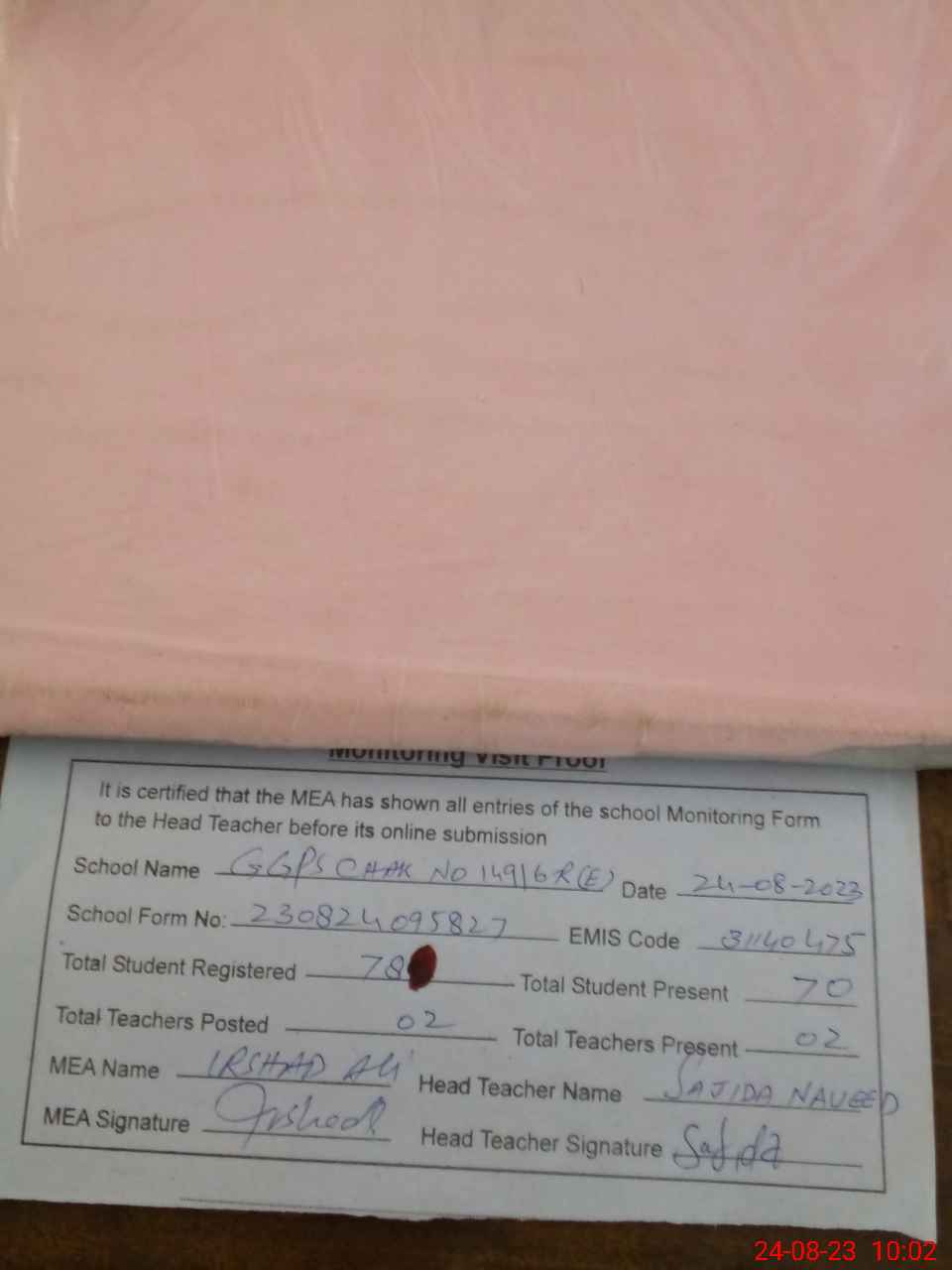 | Certified that this School was Inspected by the Undersigned MEA/DMO Today and the Information Stated Above is as Per Record. | |||||