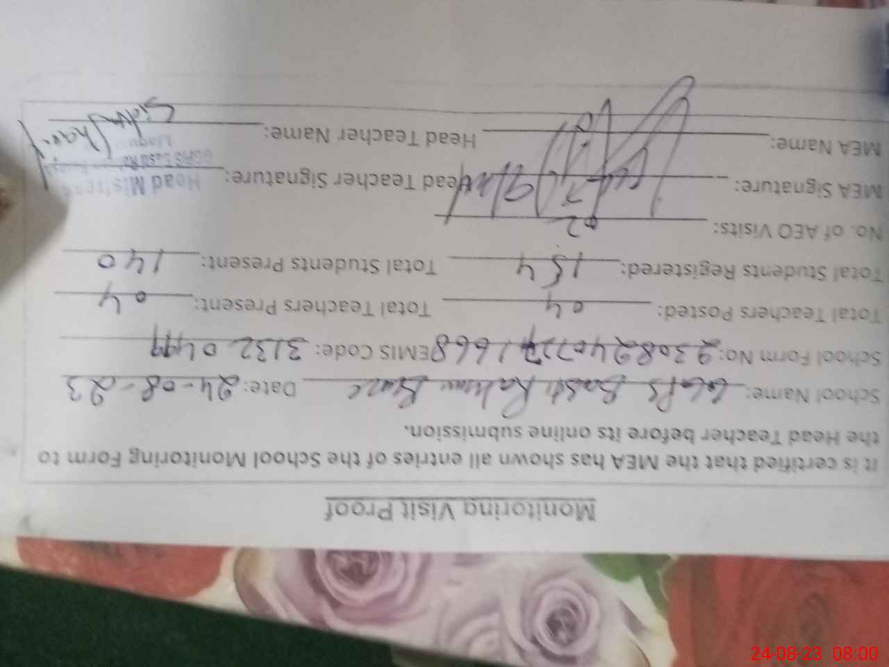 | Attendance Register | Head Teacher | MEA with School | Visit Proof |