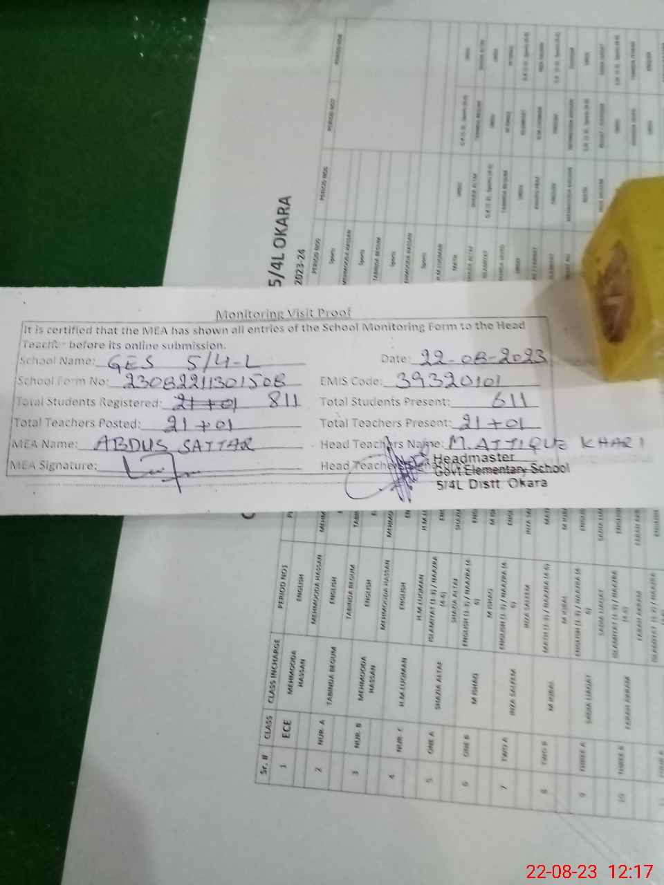 | Attendance Register | Head Teacher | MEA with School | Visit Proof |
