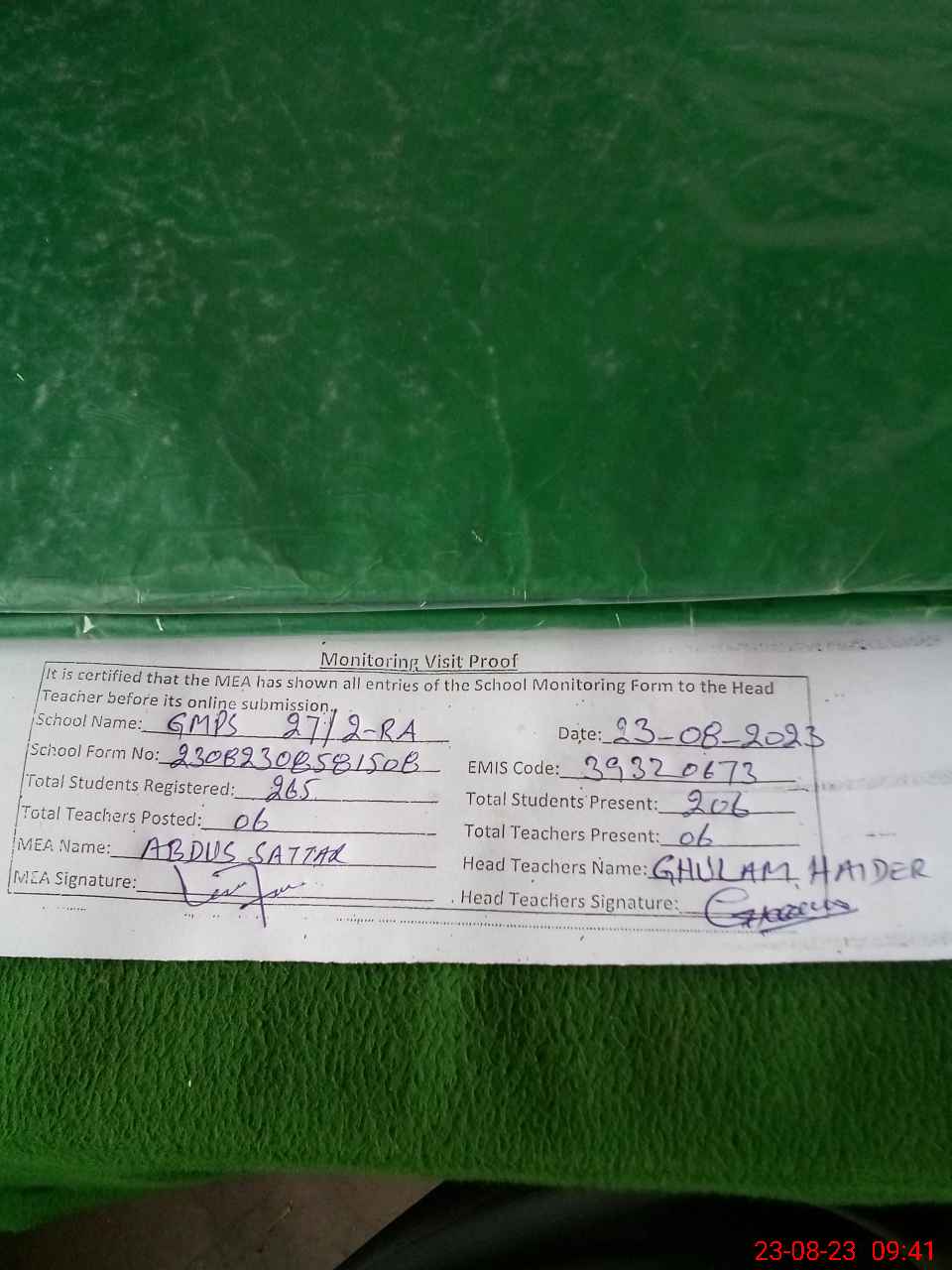 | Attendance Register | Head Teacher | MEA with School | Visit Proof |