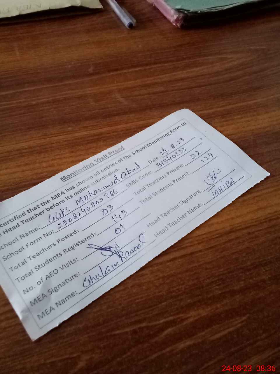 | Attendance Register | Head Teacher | MEA with School | Visit Proof |