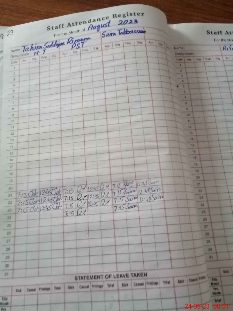 | 31**** | Ta**** Si**** | PST | Regular | 0 | 8 | 0 | 0 | 0 | 0 | 0 | 0 | 0 | Absent (Un-Authorized) |