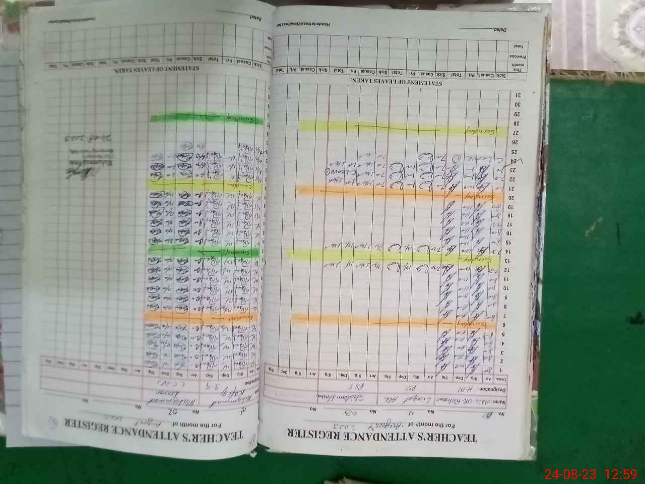 | Total no. of Classrooms: 6 No. of Classrooms Used for Teaching: 6 No. of Classrooms Storing Old Furniture, FTBs, etc: 0Comments if Any: NSB and FTF record register not updated for the month of July2023 and bank account statement for the month of June and July 2023 not available |