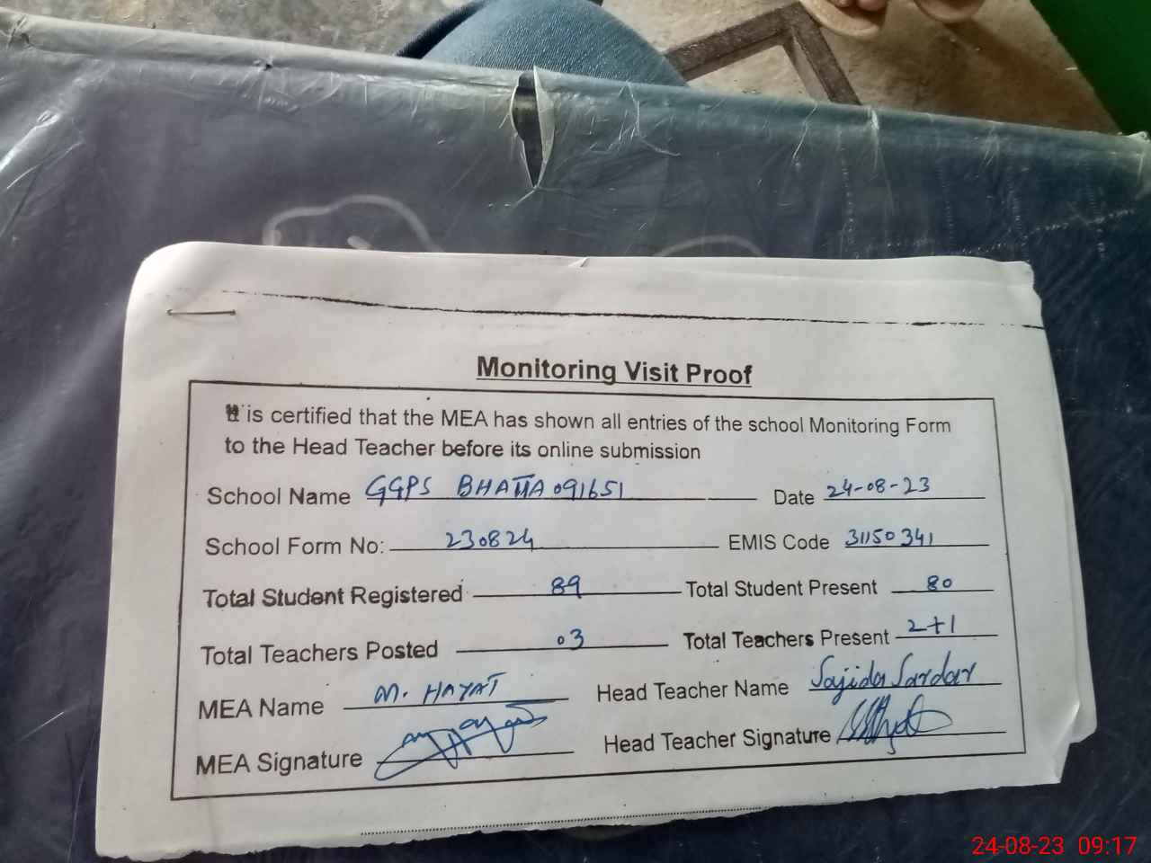 | Attendance Register | Head Teacher | MEA with School | Visit Proof |