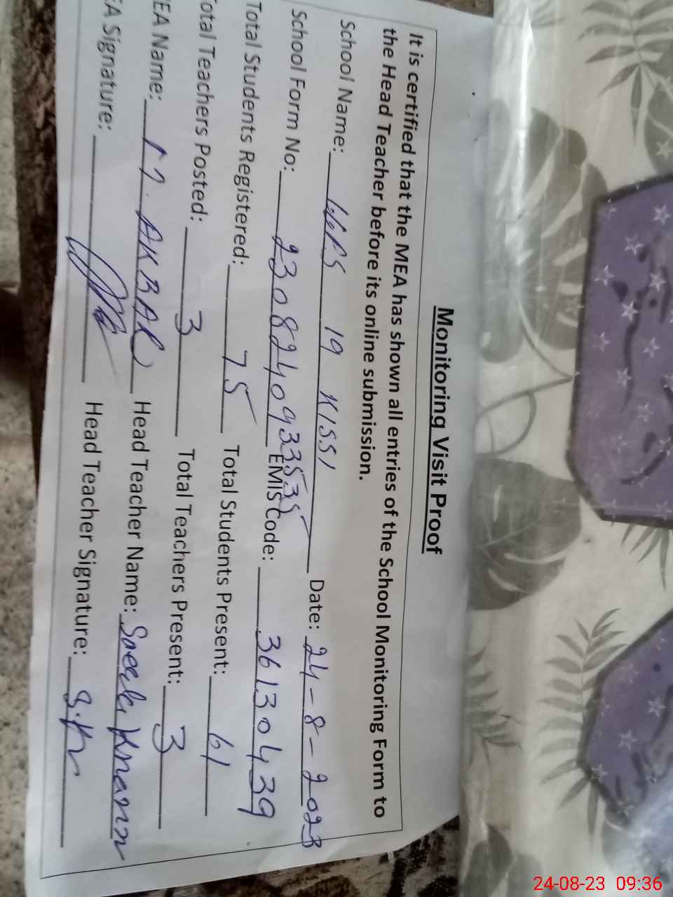 | Attendance Register | Head Teacher | MEA with School | Visit Proof |