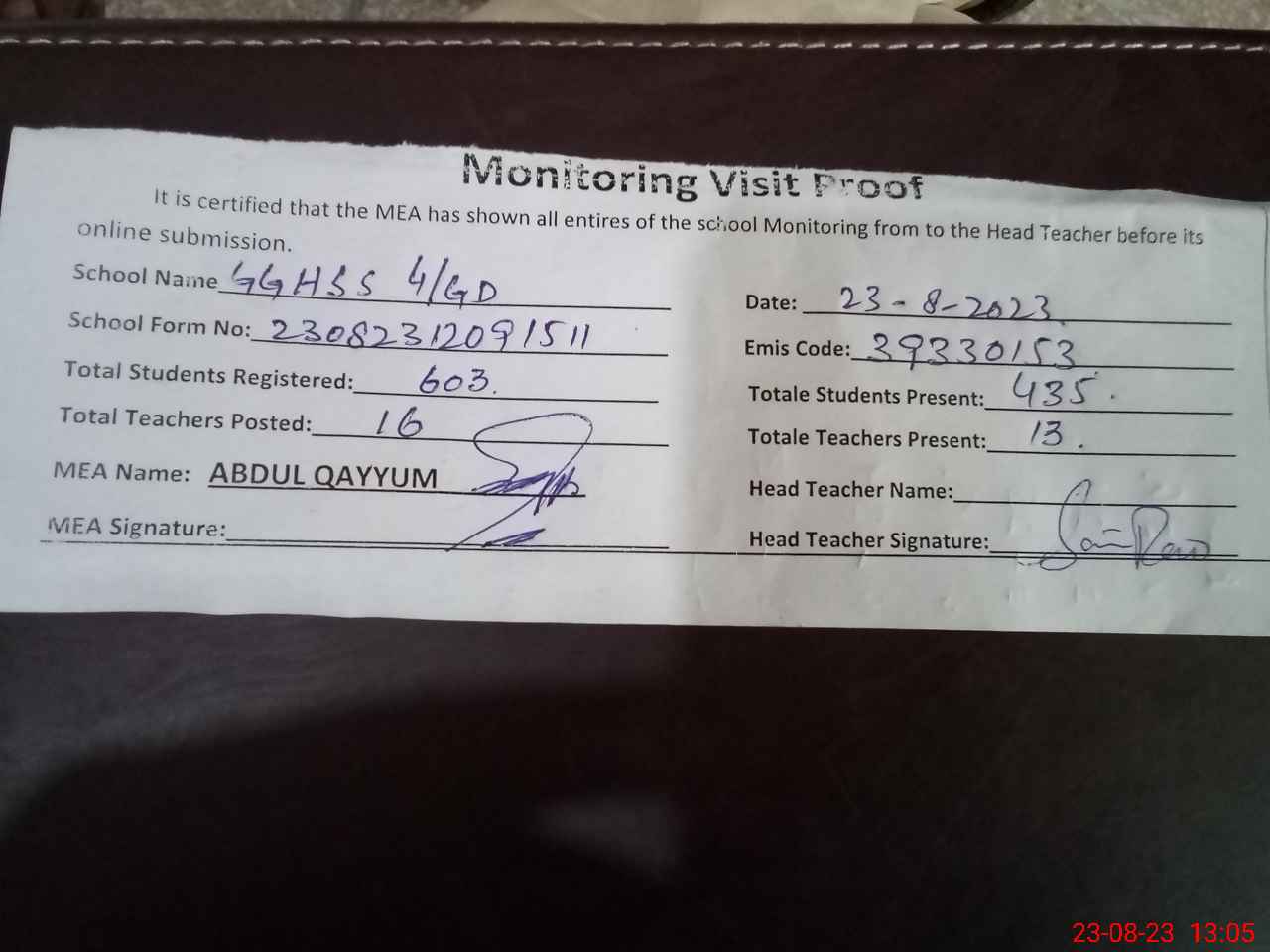 | Attendance Register | Head Teacher | MEA with School | Visit Proof |