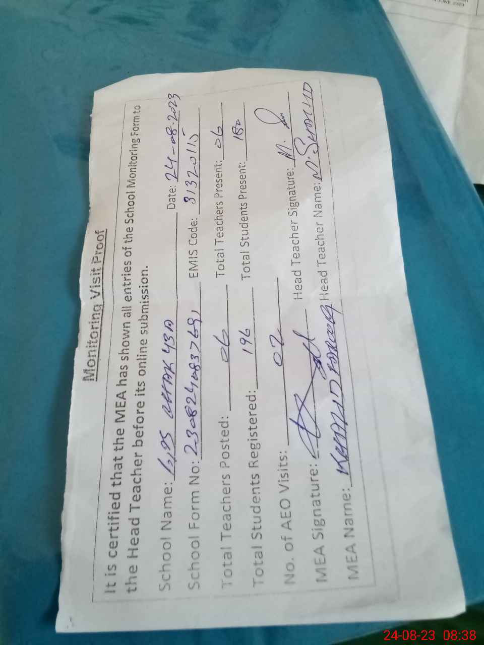| Attendance Register | Head Teacher | MEA with School | Visit Proof |