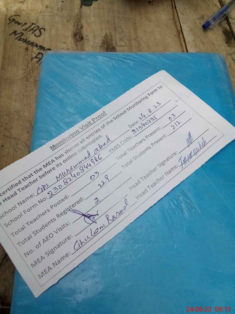 | Attendance Register | Head Teacher | MEA with School | Visit Proof |