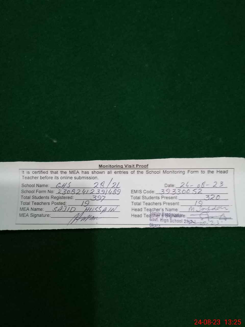 | Certified that this School was Inspected by the Undersigned MEA/DMO Today and the Information Stated Above is as Per Record. | |||||