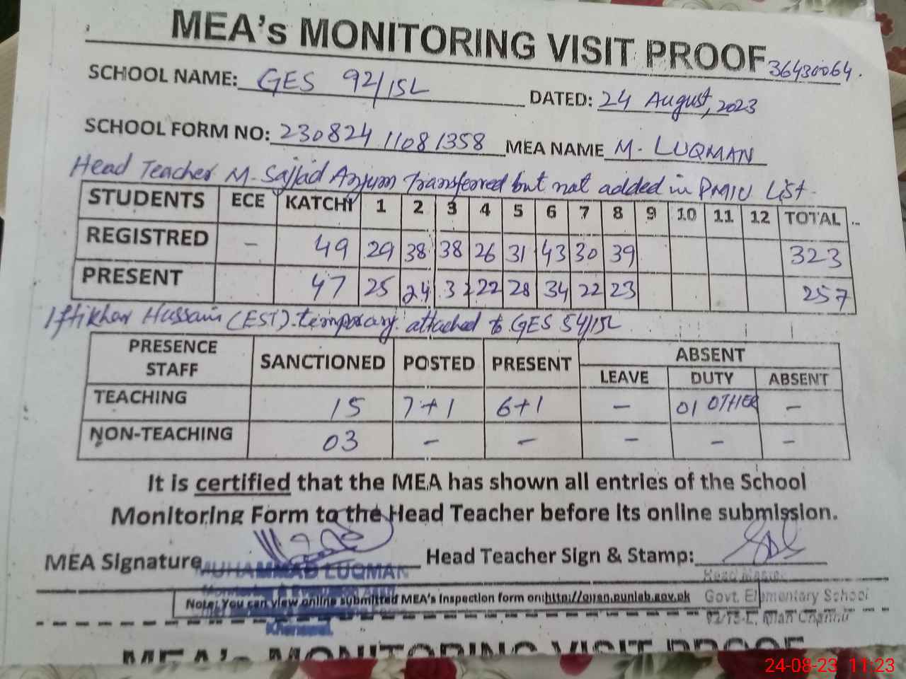 | Attendance Register | Head Teacher | MEA with School | Visit Proof |