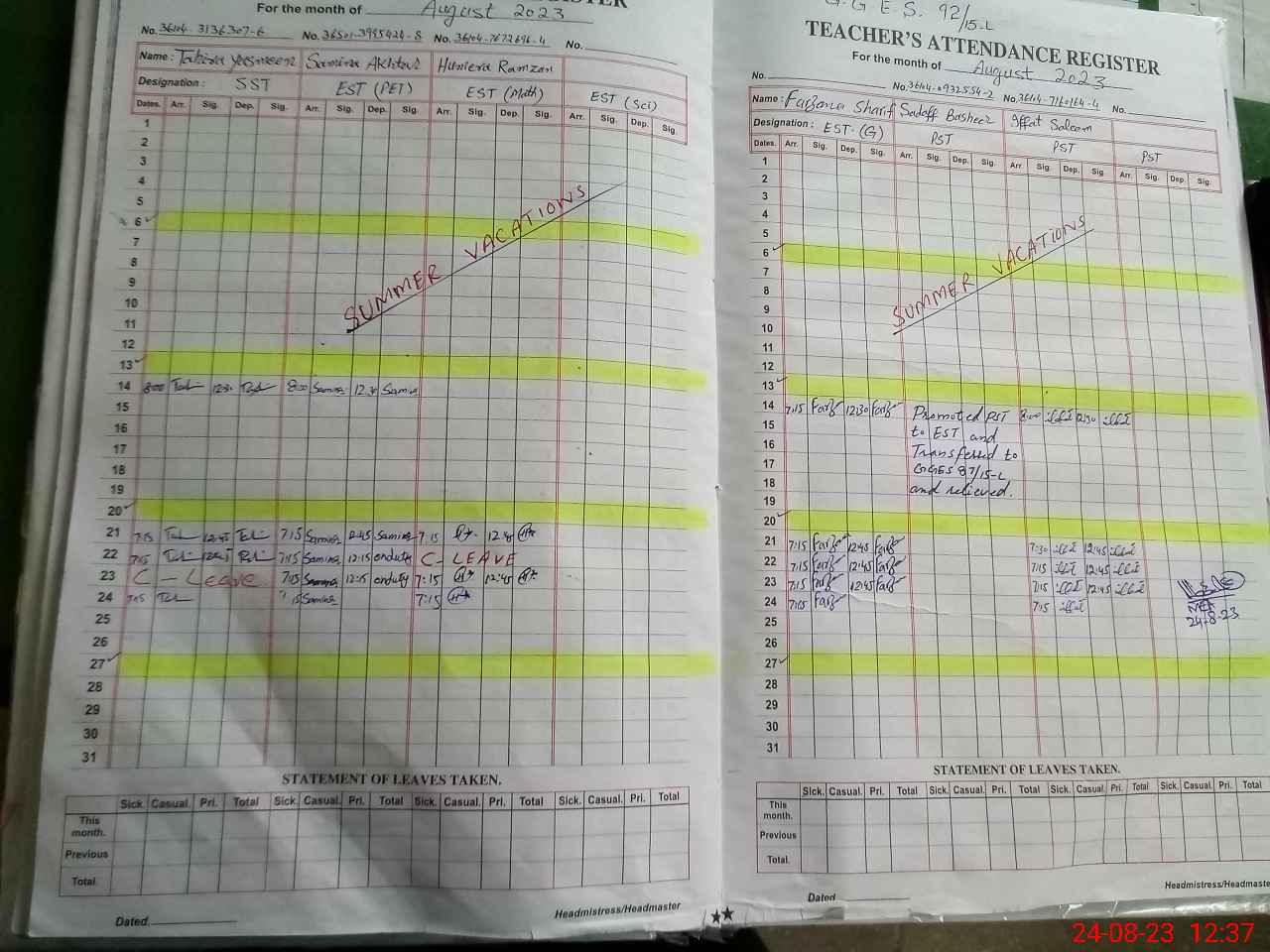 | CNIC | Full Name | Designation | R/C | Absence During Last Calender Month |
