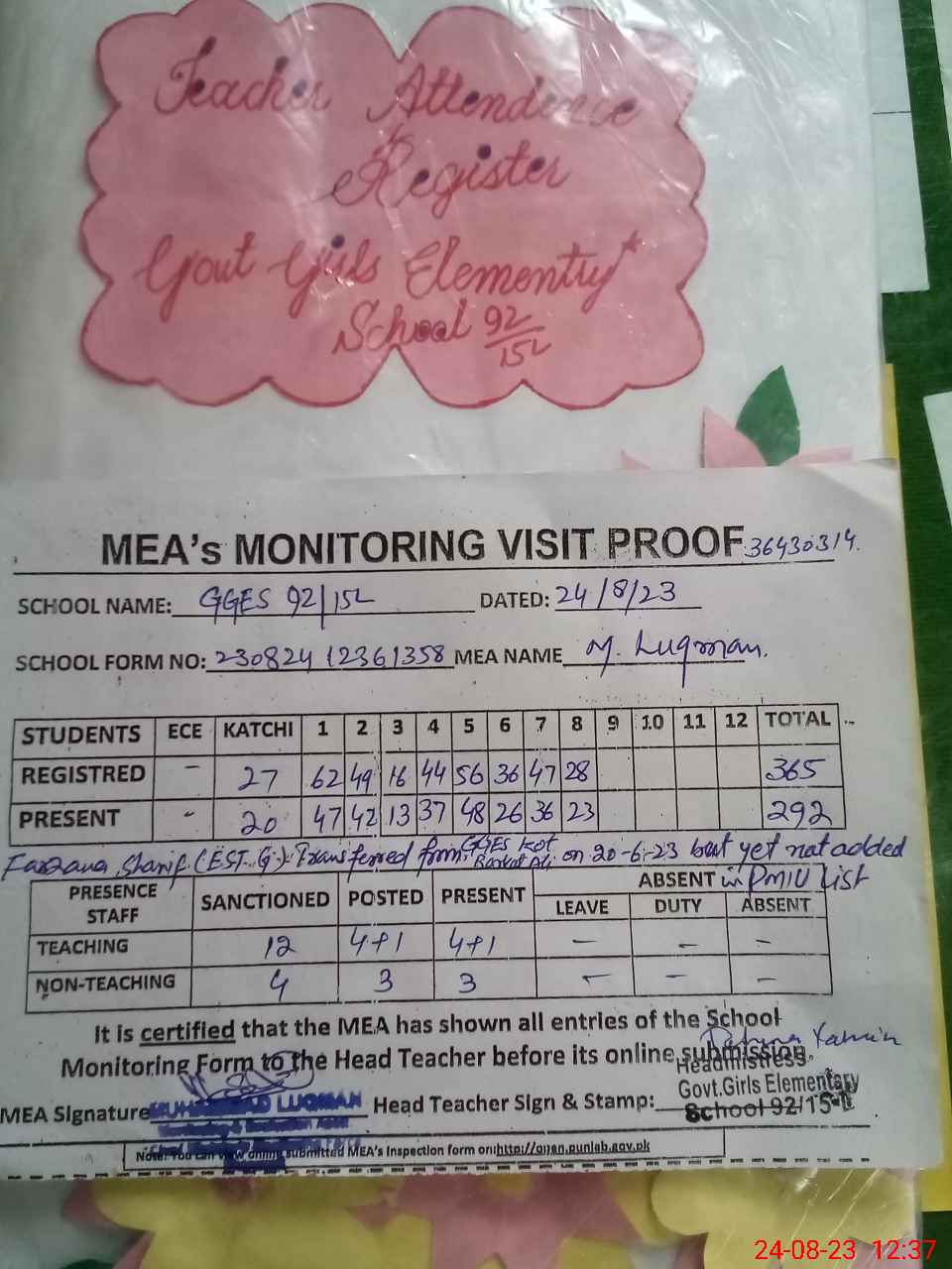 | Attendance Register | Head Teacher | MEA with School | Visit Proof |