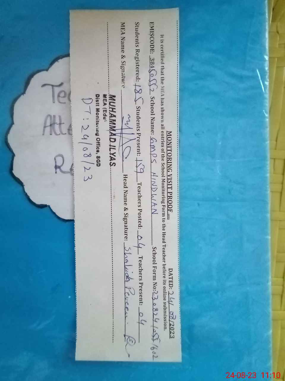 | Attendance Register | Head Teacher | MEA with School | Visit Proof |
