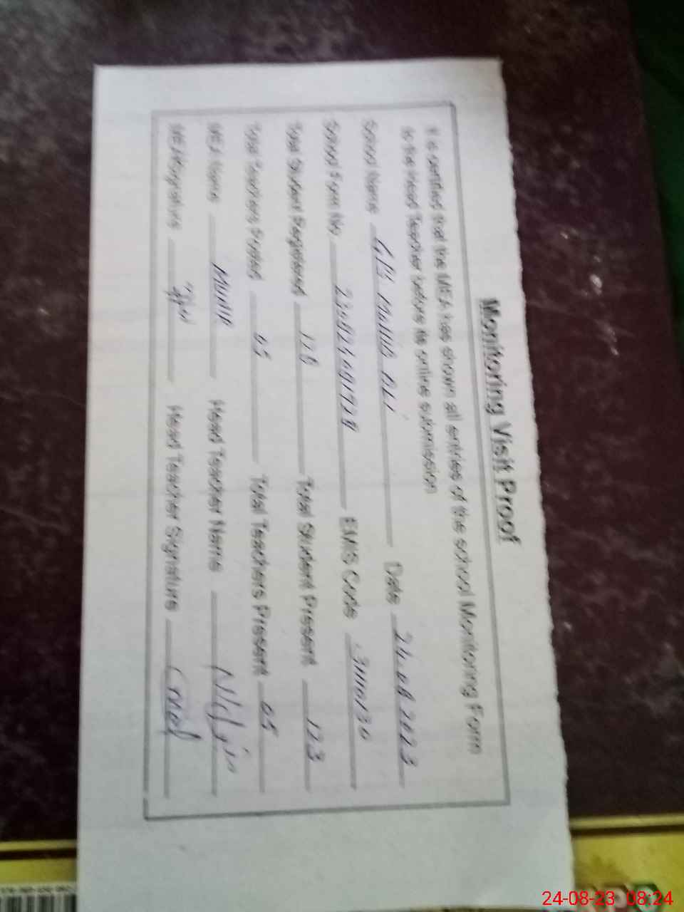 | Attendance Register | Head Teacher | MEA with School | Visit Proof |