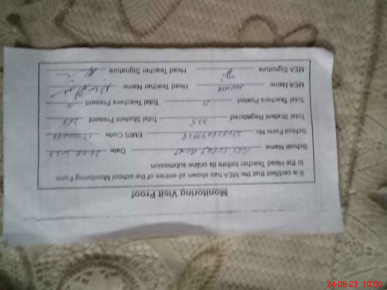| Certified that this School was Inspected by the Undersigned MEA/DMO Today and the Information Stated Above is as Per Record. | |||||