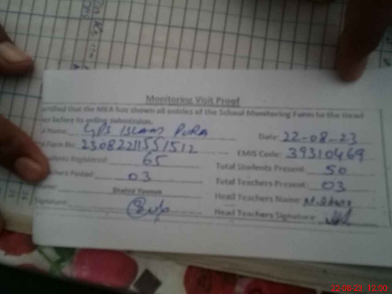 | Attendance Register | Head Teacher | MEA with School | Visit Proof |
