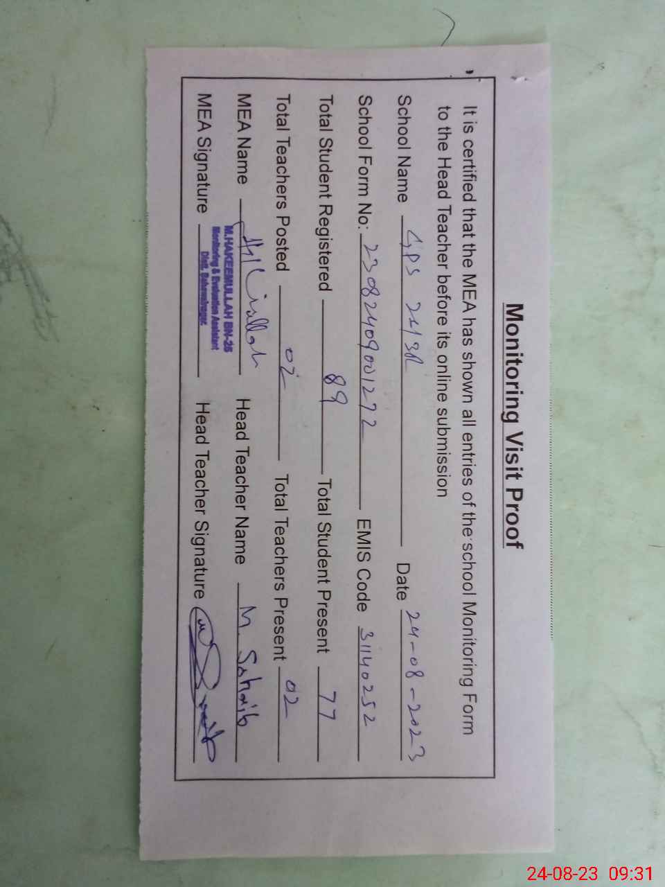| Attendance Register | Head Teacher | MEA with School | Visit Proof |
