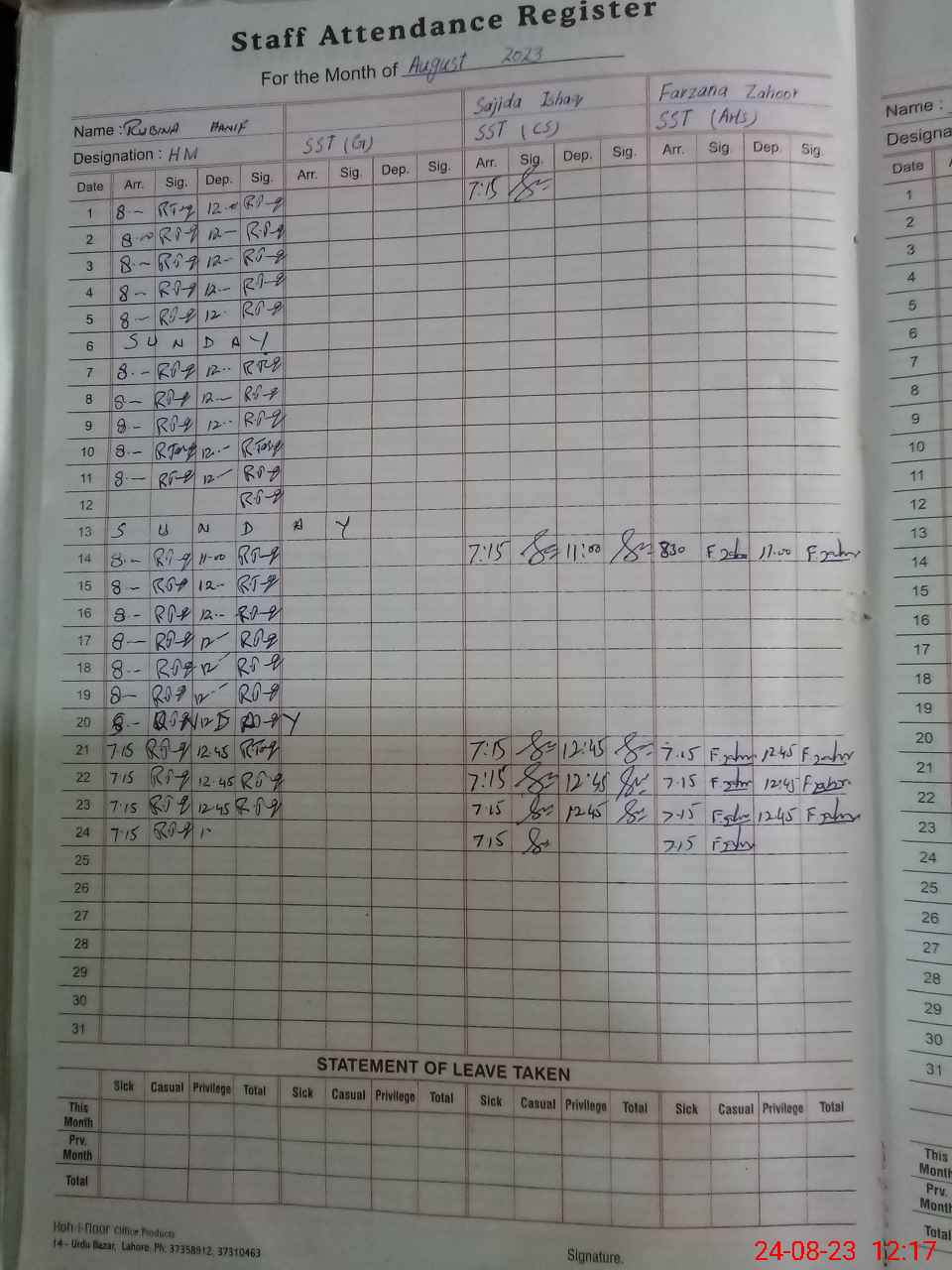 | CNIC | Full Name | Designation | R/C | Absence During Last Calender Month |