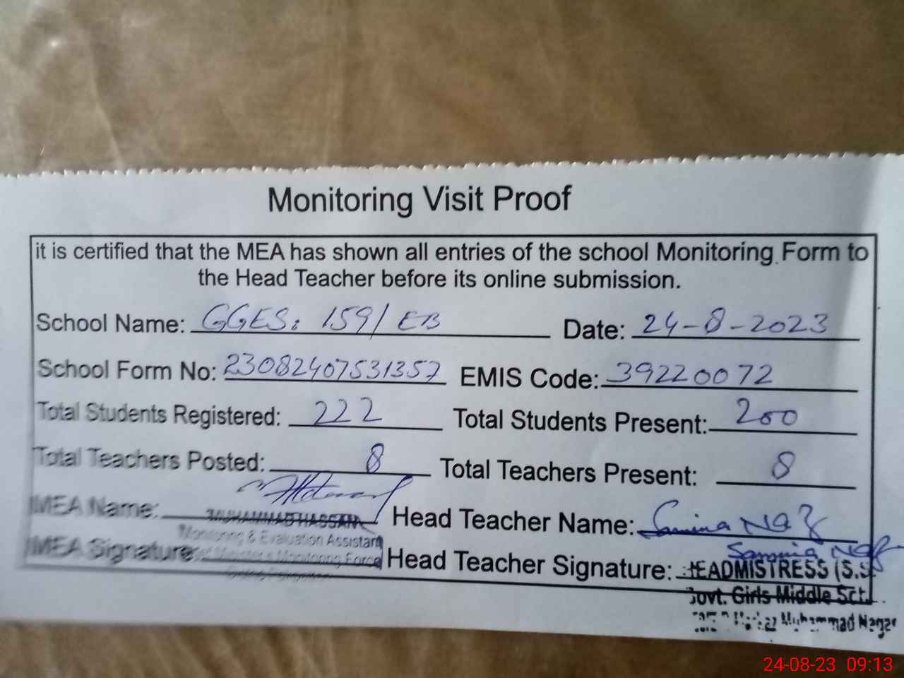 | Attendance Register | Head Teacher | MEA with School | Visit Proof |