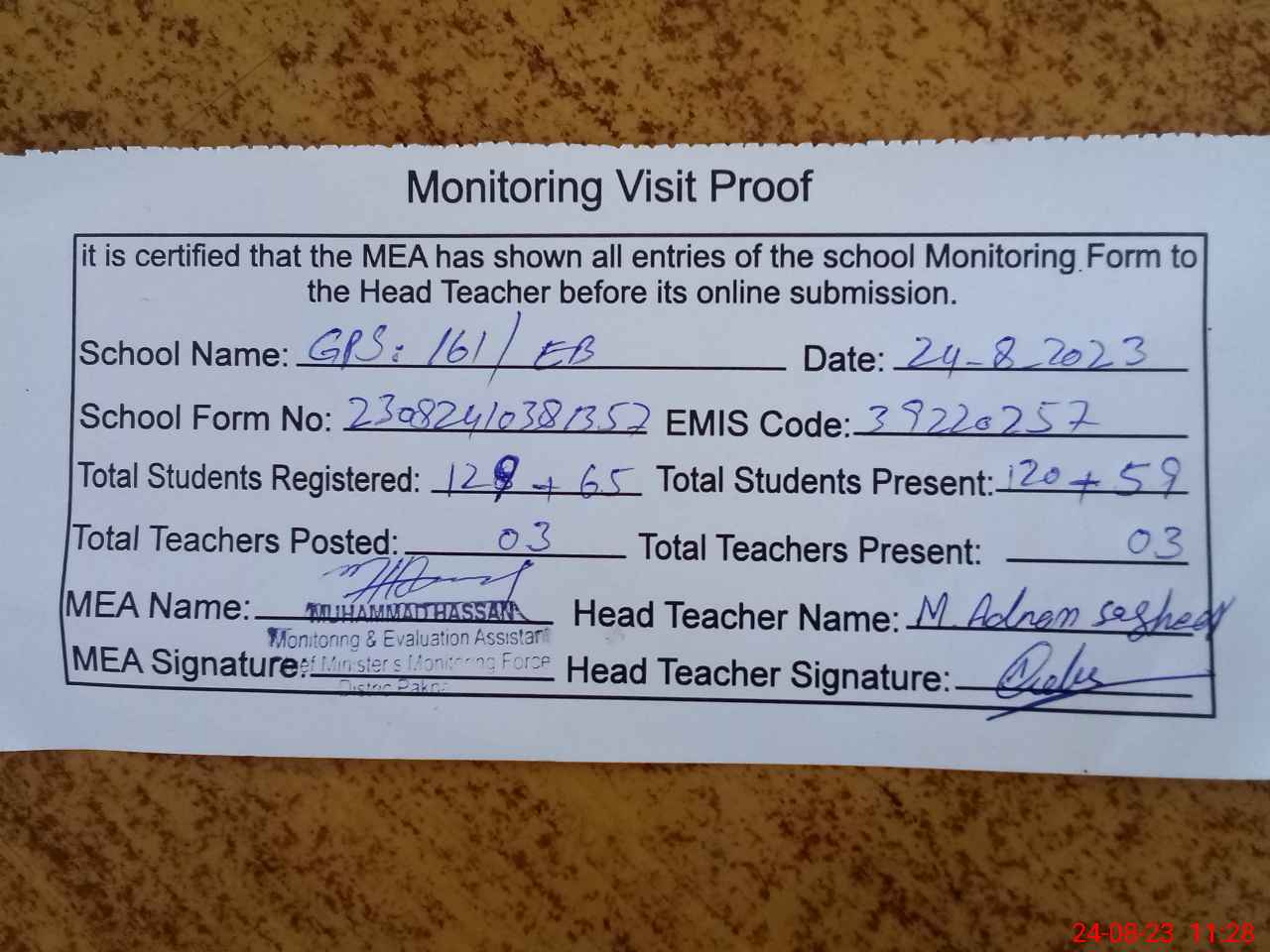| EMIS Code: 39220257 | Name of School: GPS 161 EB | |||