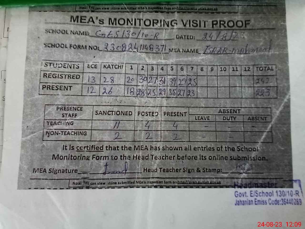 | Attendance Register | Head Teacher | MEA with School | Visit Proof |