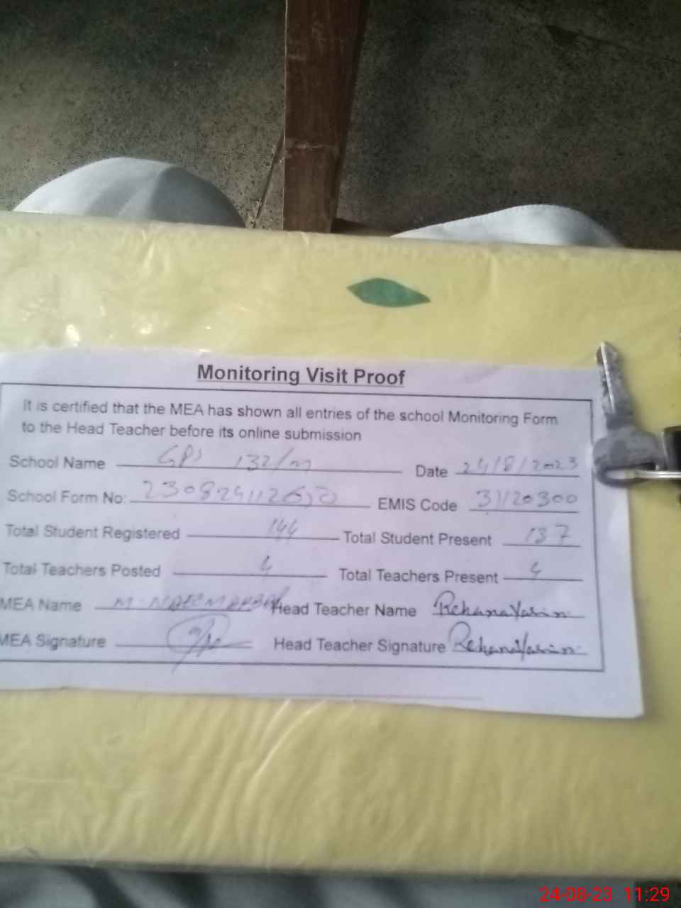| Attendance Register | Head Teacher | MEA with School | Visit Proof |