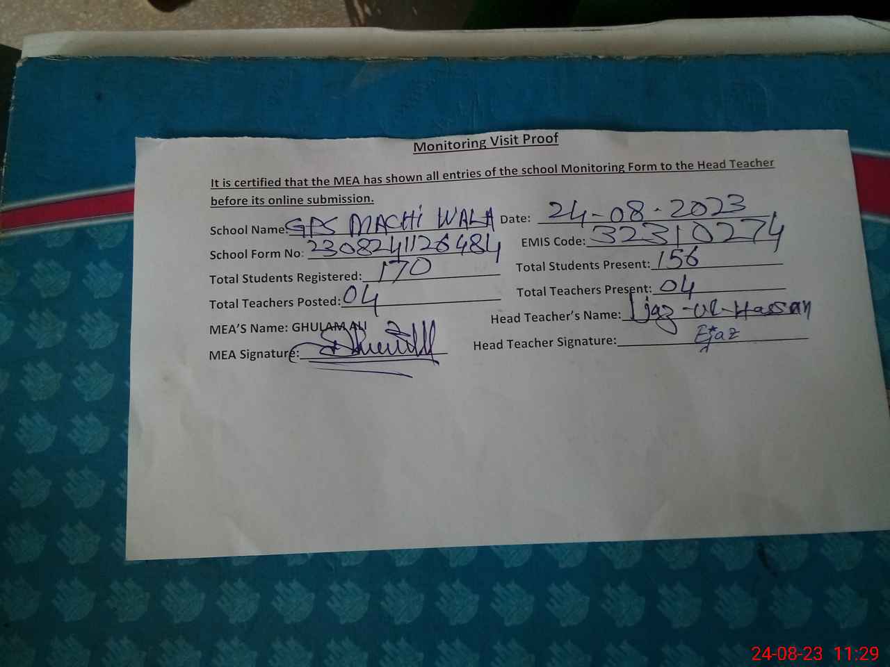 | Attendance Register | Head Teacher | MEA with School | Visit Proof |