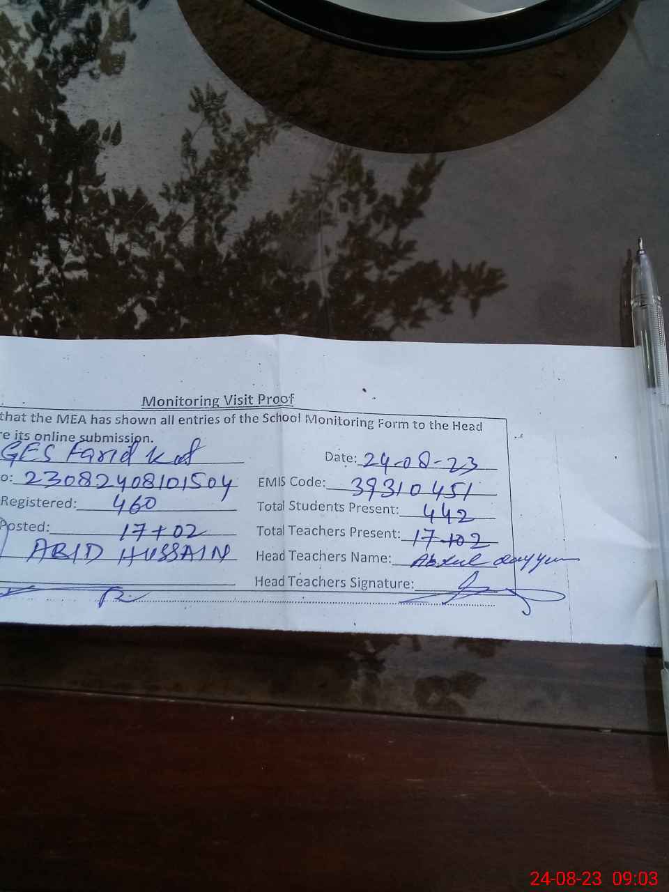 | Attendance Register | Head Teacher | MEA with School | Visit Proof |