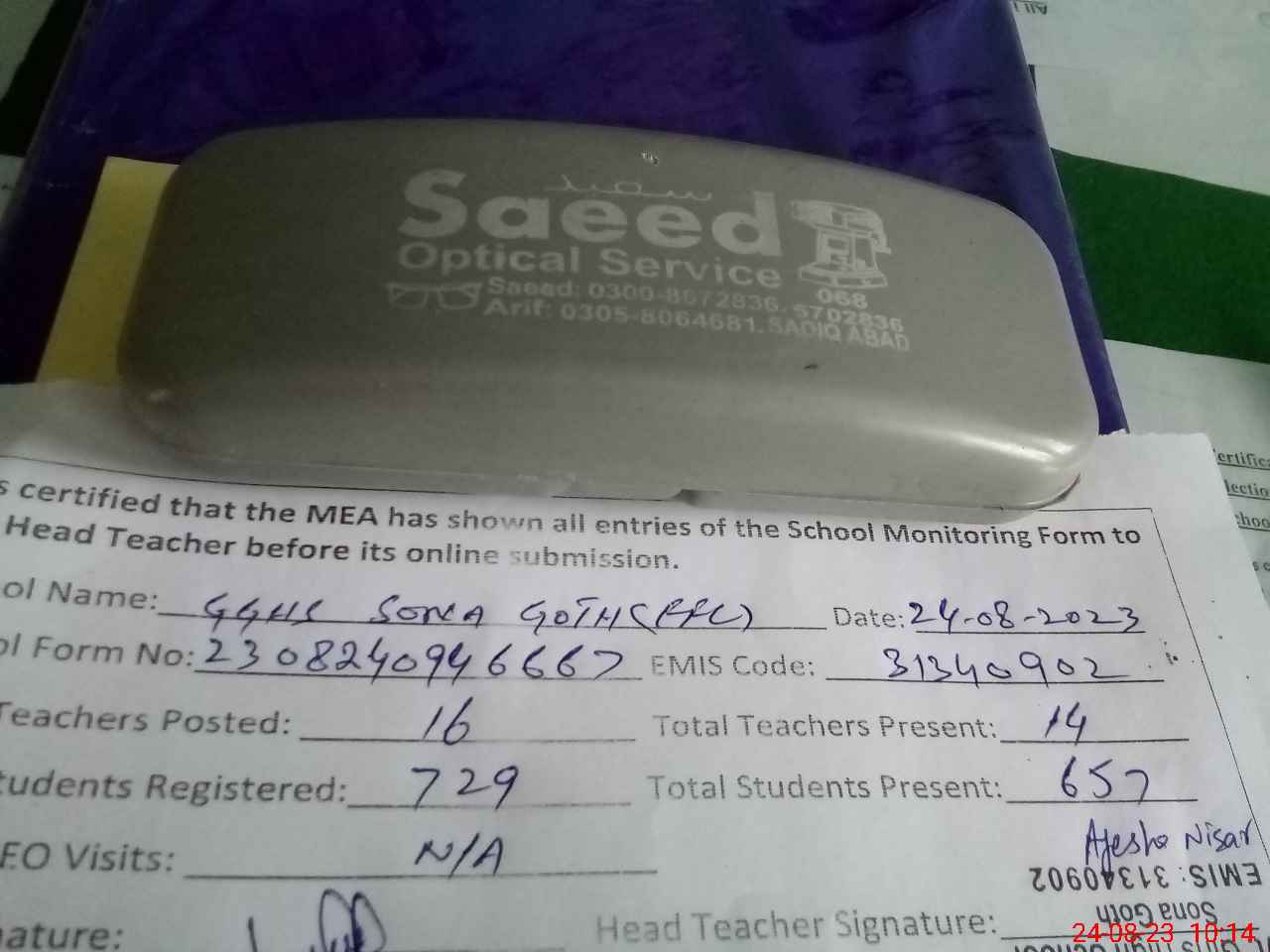 | Attendance Register | Head Teacher | MEA with School | Visit Proof |