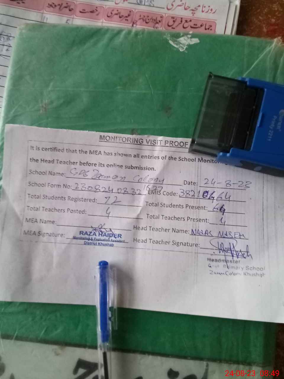 | Attendance Register | Head Teacher | MEA with School | Visit Proof |
