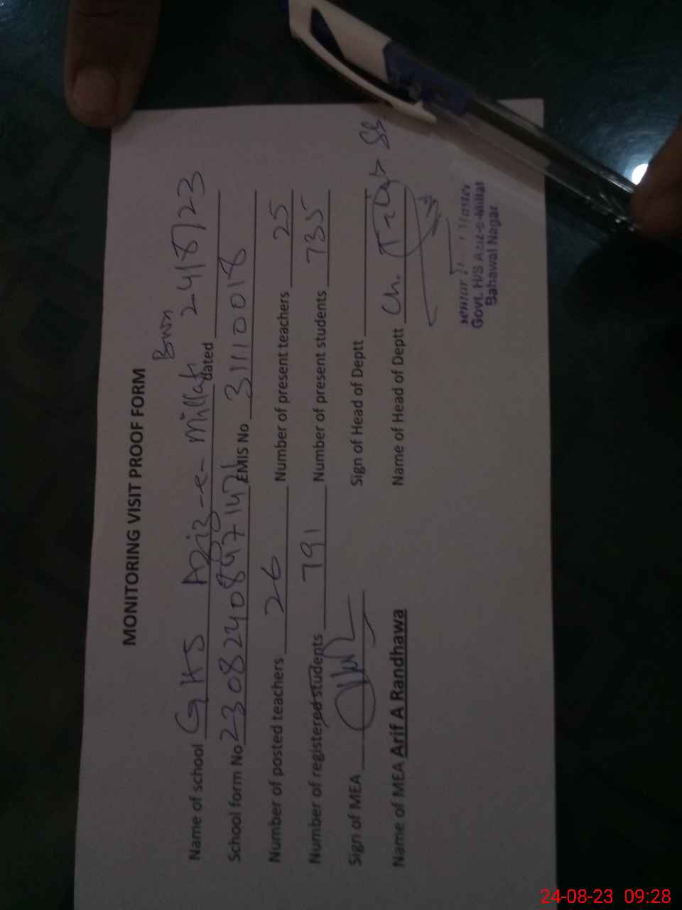 | Certified that this School was Inspected by the Undersigned MEA/DMO Today and the Information Stated Above is as Per Record. | |||||