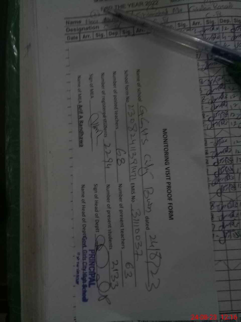 | Certified that this School was Inspected by the Undersigned MEA/DMO Today and the Information Stated Above is as Per Record. | |||||