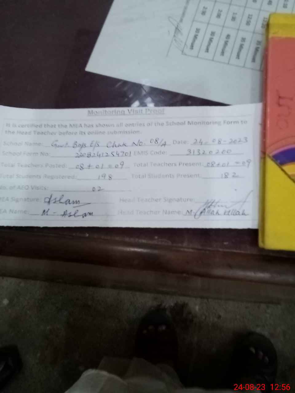 | Attendance Register | Head Teacher | MEA with School | Visit Proof |