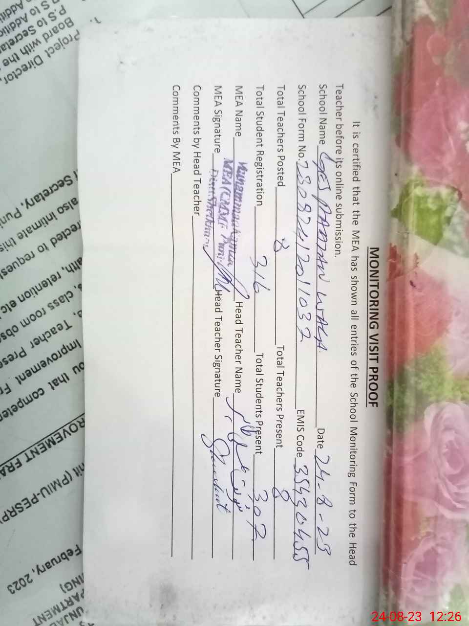 | Attendance Register | Head Teacher | MEA with School | Visit Proof |