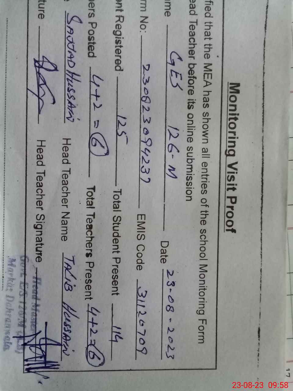 | EMIS Code: 31120709 | Name of School: GES CHAK NO.126/M AB | |||
