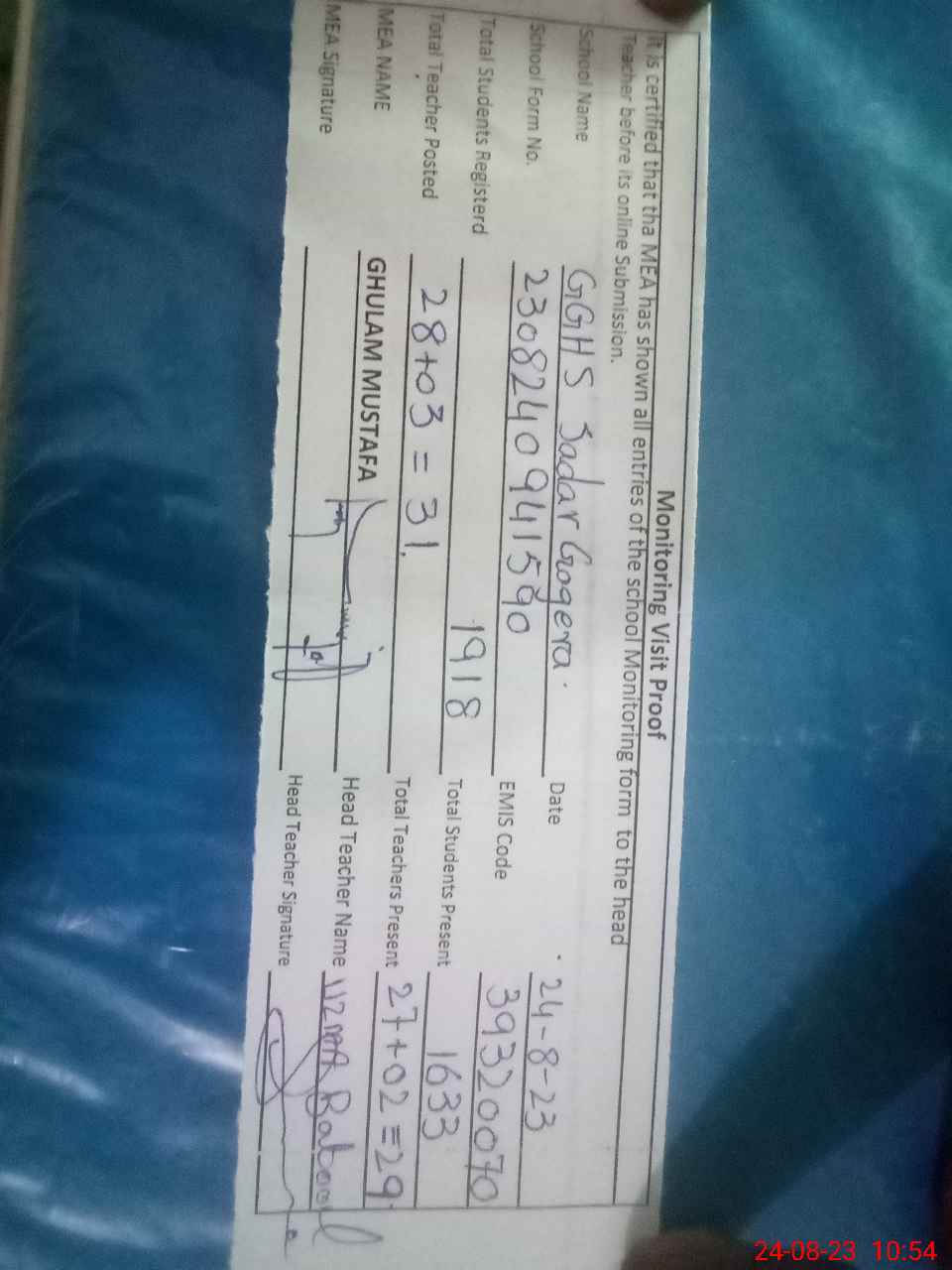 | Attendance Register | Head Teacher | MEA with School | Visit Proof |