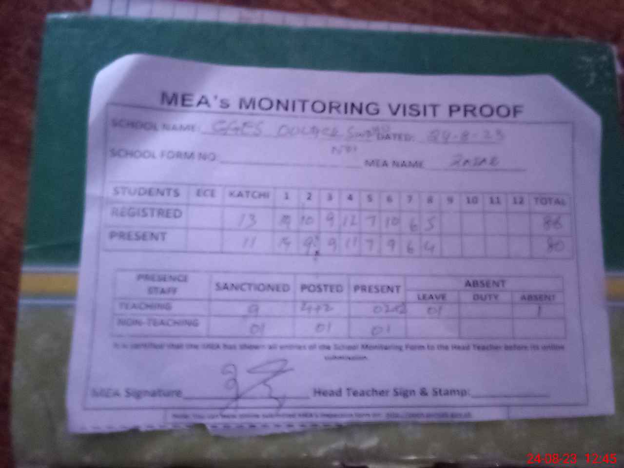 | Attendance Register | Head Teacher | MEA with School | Visit Proof |