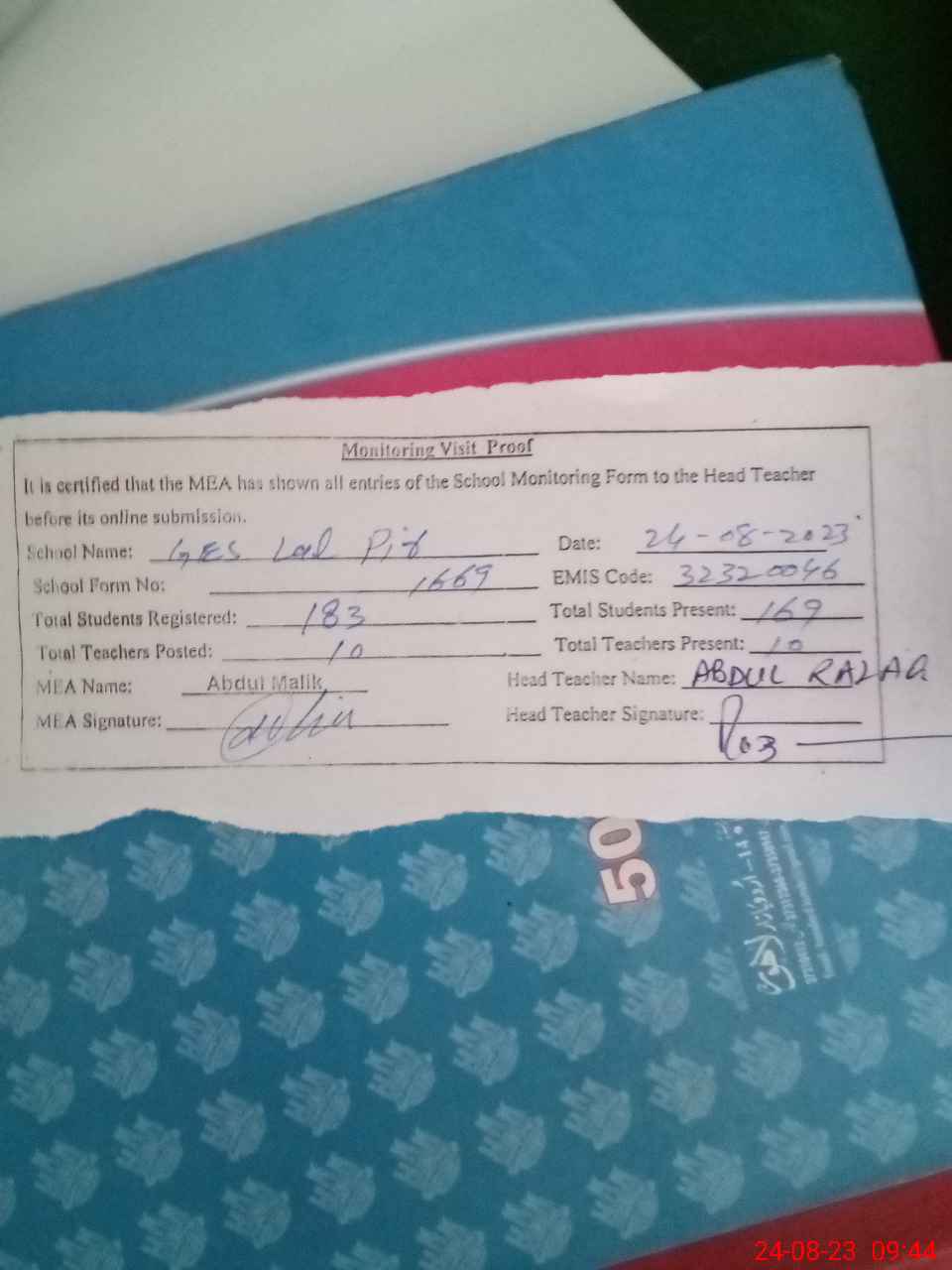 | Attendance Register | Head Teacher | MEA with School | Visit Proof |
