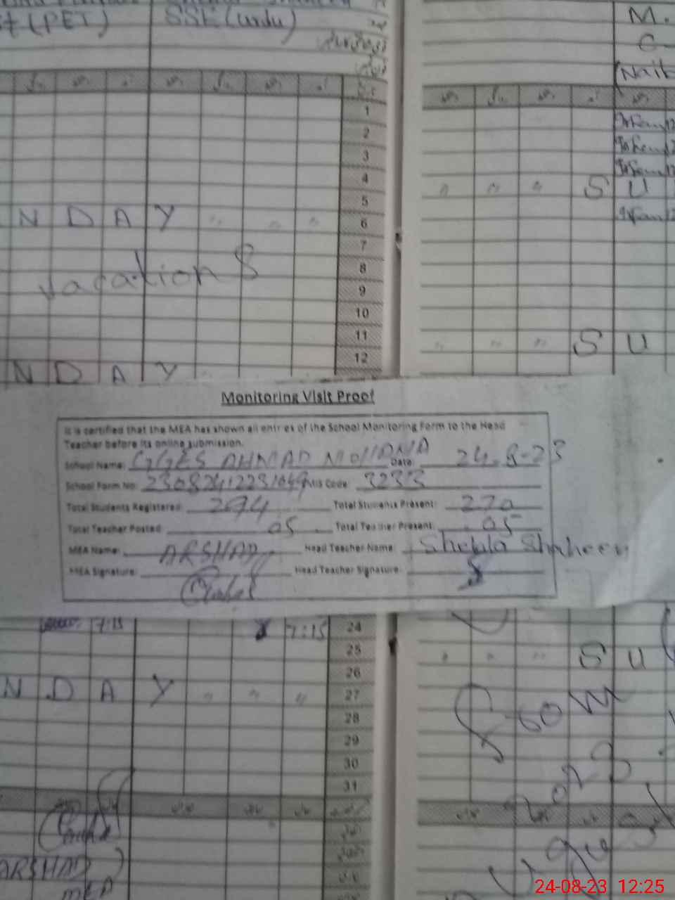 | Attendance Register | Head Teacher | MEA with School | Visit Proof |