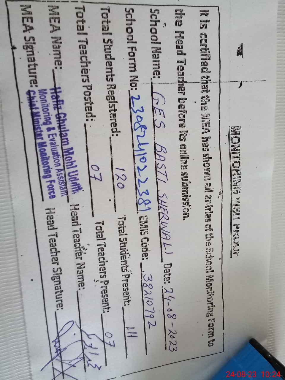 | EMIS Code: 38210792 | Name of School: GES BASTI SHER WALI | |||