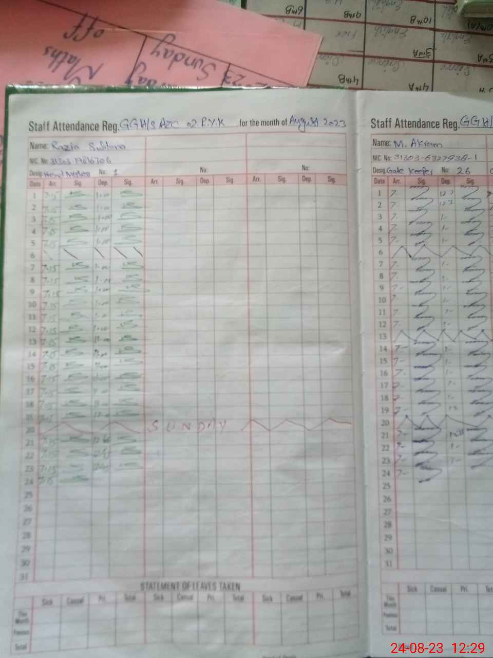 | CNIC | Full Name | Designation | R/C | Absence During Last Calender Month |