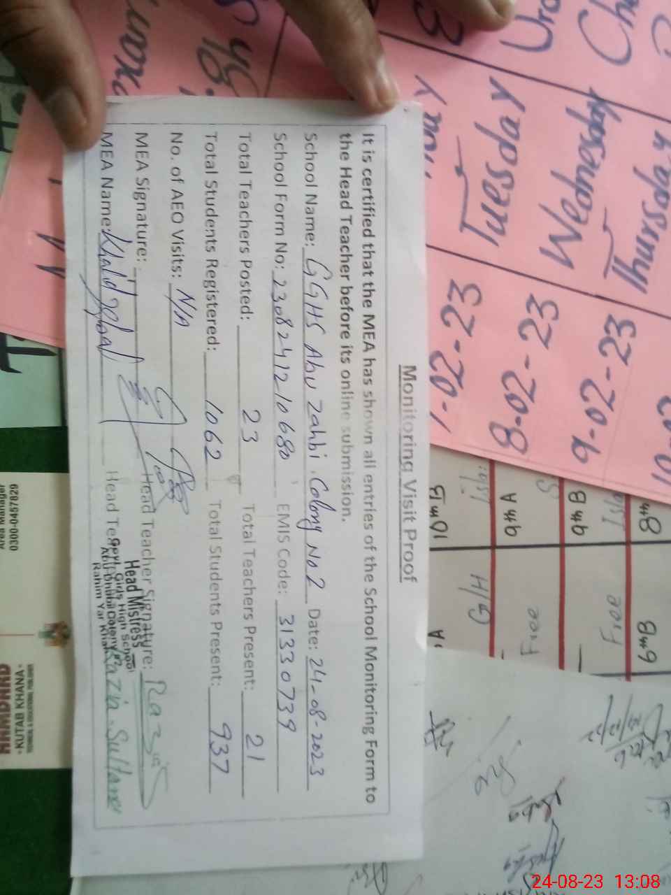 | Attendance Register | Head Teacher | MEA with School | Visit Proof |