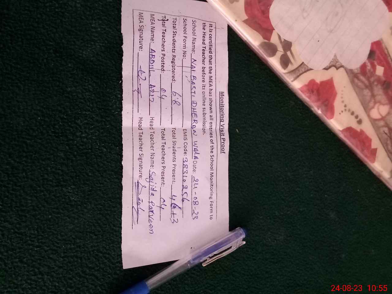 | Certified that this School was Inspected by the Undersigned MEA/DMO Today and the Information Stated Above is as Per Record. | |||||