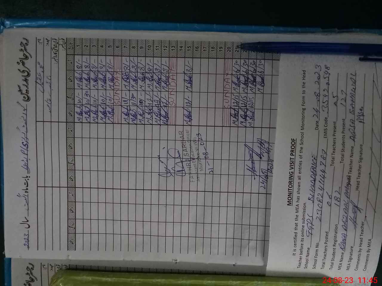 | Attendance Register | Head Teacher | MEA with School | Visit Proof |