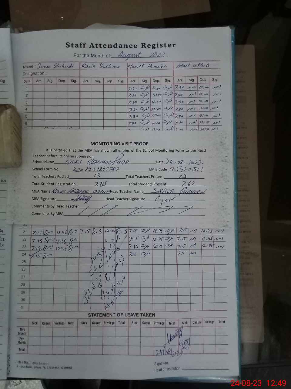 | Attendance Register | Head Teacher | MEA with School | Visit Proof |